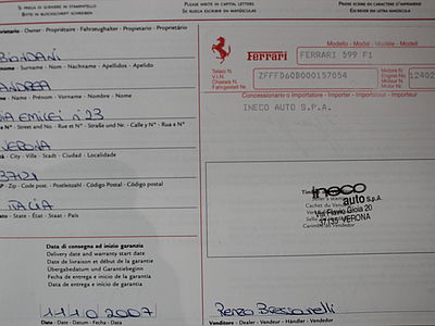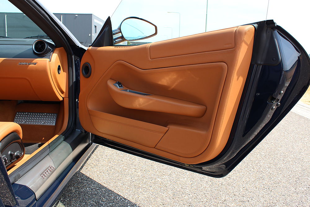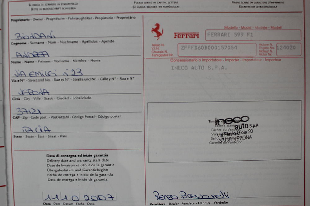 Deze prachtige 599 GTB Fiorano werd eind 2007 in het Noord Italiaanse Verona aan de eerste eigenaar uitgeleverd. In 2010 wisselde de wagen van eigenaar met slechts 4800 kilometer gereden, de wagen bleef echter in het Noorden van Italië. De donkerblauwe uni-lak in combinatie met de stijlvolle Daytona seats in cuoio leder maken van deze 599 een zeer edele verschijning en de gele remklauwen en scuderia shields, de zeer zeldzame rolkooi fabrieksoptie met de donker getinte velgen geven het Italiaanse raspaard juist weer de nodige sportieve elementen. Een uiterst geslaagde en zeldzame configuratie van deze toekomstige klassieker!