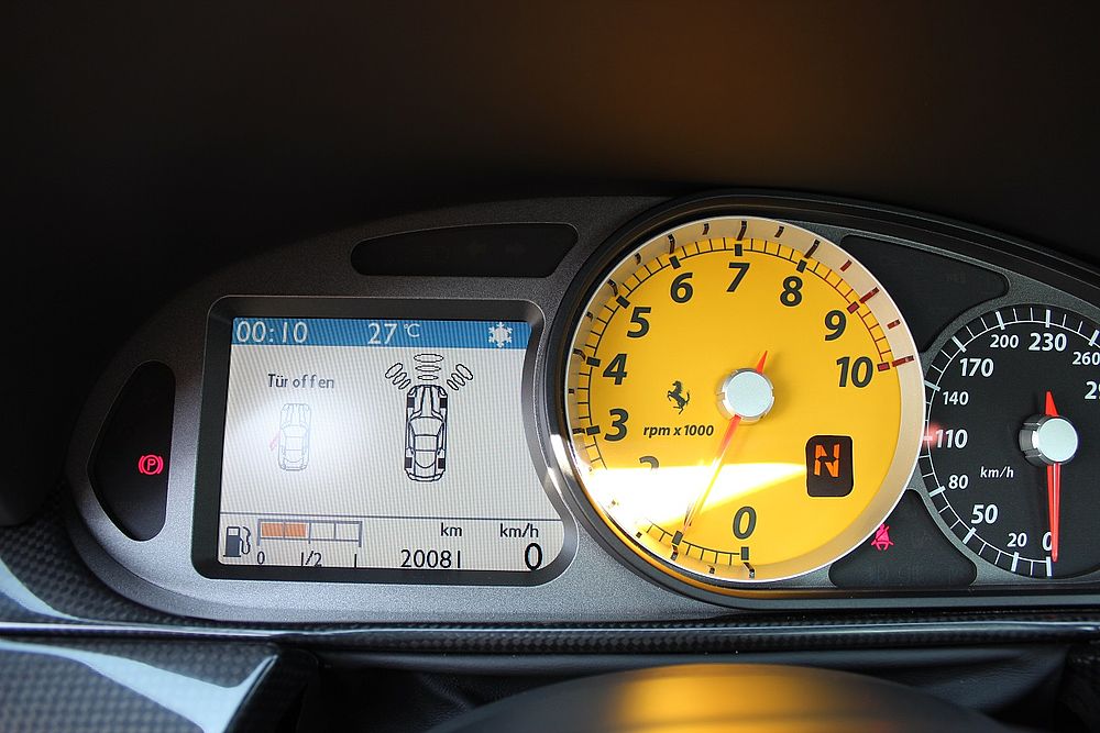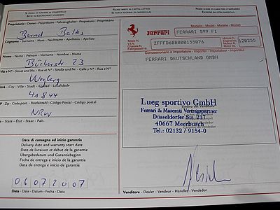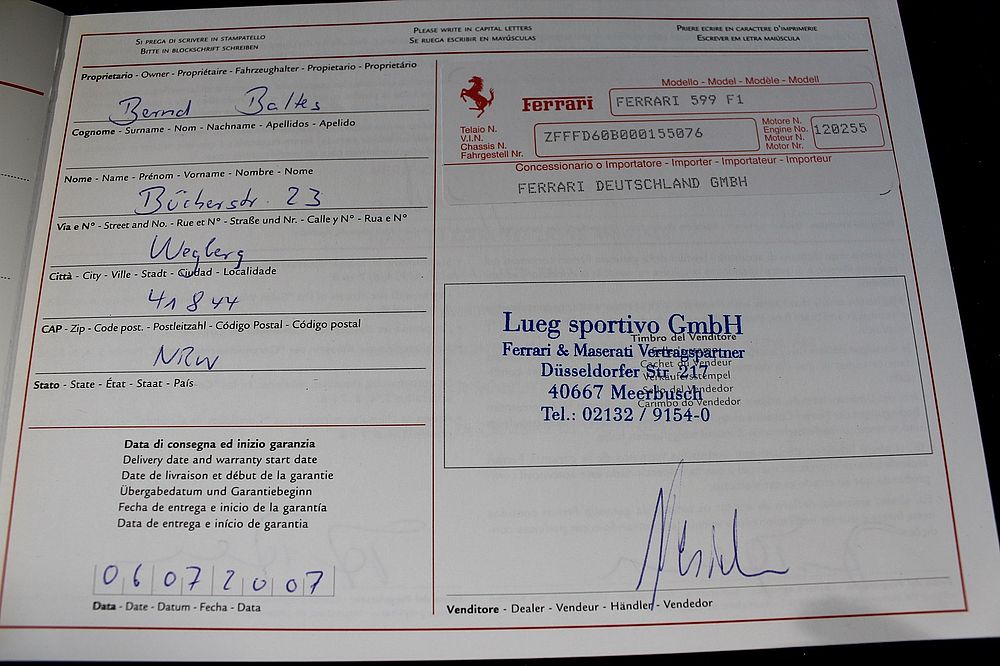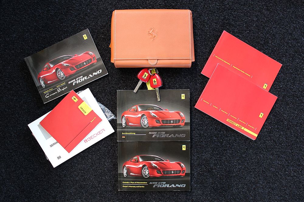 Deze uiterst sportieve 599 Fiorano is in 2007 nieuw verkocht bij Ferrari Düsseldorf. Aldaar is de wagen door de enige eigenaar ook altijd op een uitstekende manier geserviced. De Italiaanse Gran Turismo oogt uiterst sportief in het traditionele rosso corsa gecombineerd met het interieur waar veel carbon elementen in vertegenwoordigd zijn en de prachtige Daytona Seats in zwart leer. Zowel technisch alsook optisch een overtuigende wagen met een lage kilometerstand , 1 eigenaar en een sluitende service historie.