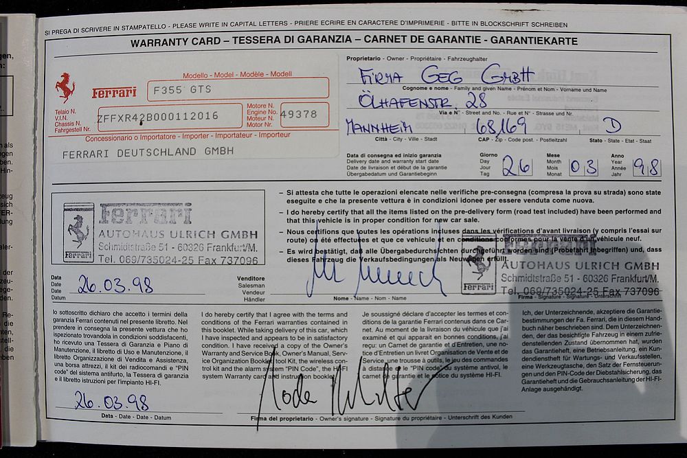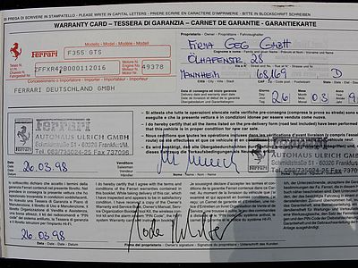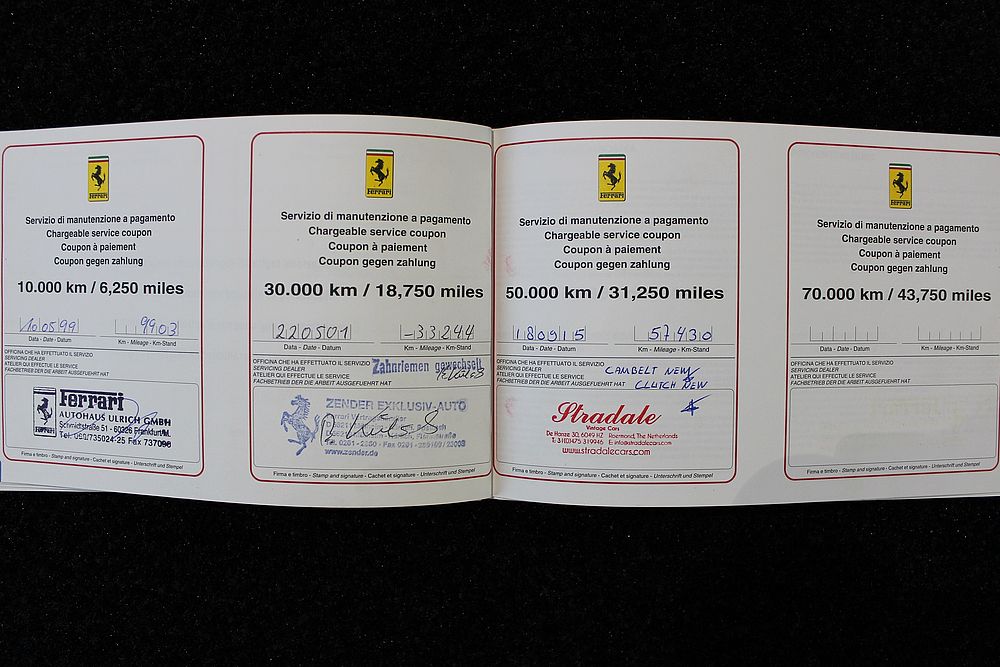 De hier getoonde F355 GTS werd in 1998 uitgeleverd in Duitsland en vond zijn weg in 2003 middels een Engelse handelaar naar Zweden. Aldaar kende de wagen 2 bezitters alvorens de wagen aan onze selectie werd toegevoegd. Deze F355 GTS is bij ons voorzien van een volledig nieuwe, originele lak en ook het interieur heeft een liefdevolle behandeling genoten waarbij wij het bekende softtouch probleem hebben aangepakt en het leer ook een nieuw leven hebben ingeblazen. Tevens zijn ook de velgen van een nieuwe glans voorzien en zijn er nieuwe banden gemonteerd. Motorisch heeft de Tour de France een uitgebreid groot onderhoud genoten, waarbij ook de koppeling is vervangen, dit alles volledig gedocumenteerd. Bij de wagen is veel historie aanwezig en is feitelijk gezien in nieuwstaat.